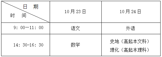 全国成人高校招生考试日期定为10月23日、24日两天。考试时间表如下: